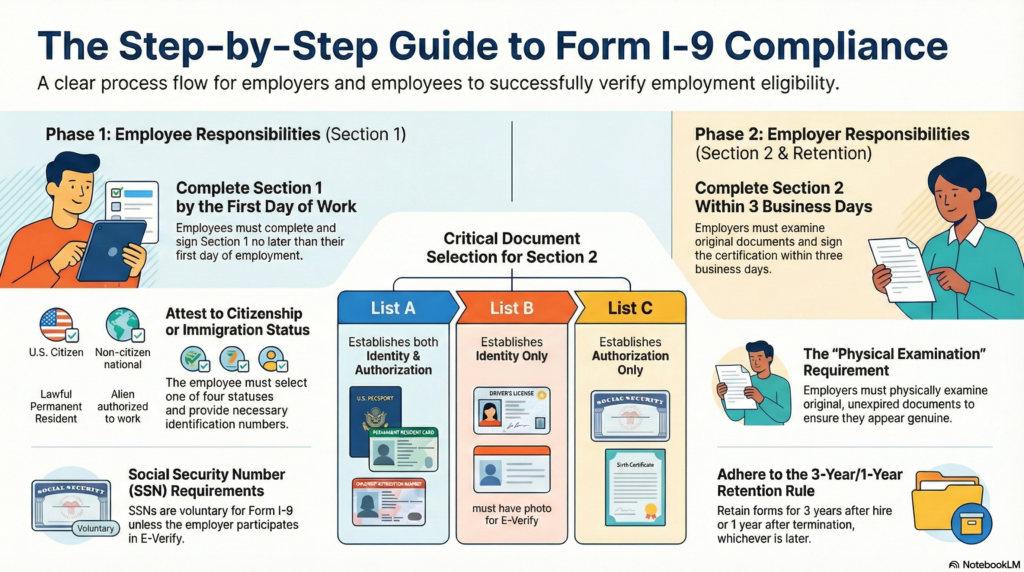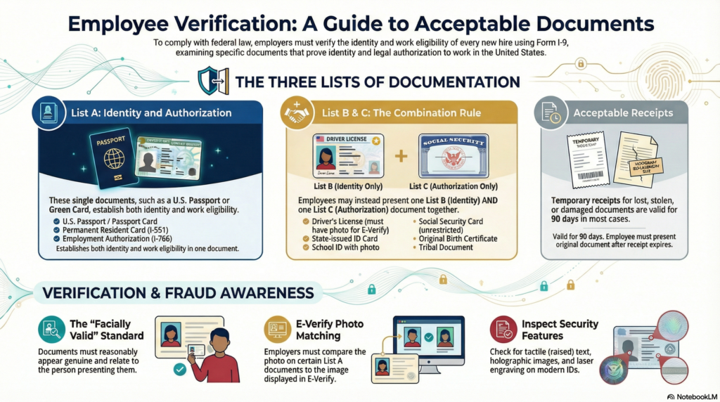This structure promotes compliance, reduces the risk of discrimination (as employers cannot require proof of citizenship, immigration status, or national origin beyond what’s needed for verification), and helps employers meet their legal obligation to examine original, unexpired documents (or acceptable receipts in limited cases) in the employee’s presence. By providing the Lists to employees—either as a hard copy or via a direct hyperlink—employers ensure transparency and enable accurate completion of Section 2 of Form I-9, where the employer records the presented documents and certifies their review. All documents must reasonably appear genuine and relate to the person presenting them, and the lists are periodically updated by USCIS to reflect changes in acceptable forms of identification.